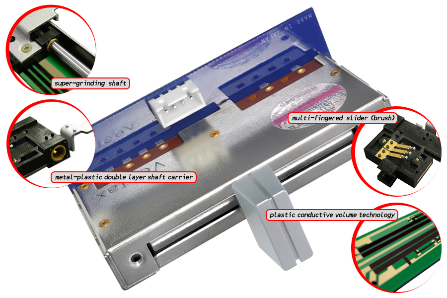 The state-of-the-art PCV™ (Plastic Conductive Volume Technology) fader is equipped conductive plastic resistor element, horizontal style control-bar design (protection against dust) and durable system which adopted the shaft of the high quality. PCV™ crossfader is tested by accredited testing laboratories for 2 million passes / 1 million cycles (18 cycles / min., sliding noise level: less than 100mV). During this time, it must not lose the quality of the audio signal that passes through it To give you an idea, standard faders leave after about 100 000 cycles; these are the minimum guaranteed values. The PCV™ crossfader/fader has a precise metal mechanism and guide shafts along which the fader slider moves and thus has a completely precise position. As a result, friction is reduced, which leads to less wear and smoother fader movement. All of PCV™ crossfaders/input faders is designed for professional applications, such as turntablism or professional club mixing consoles.