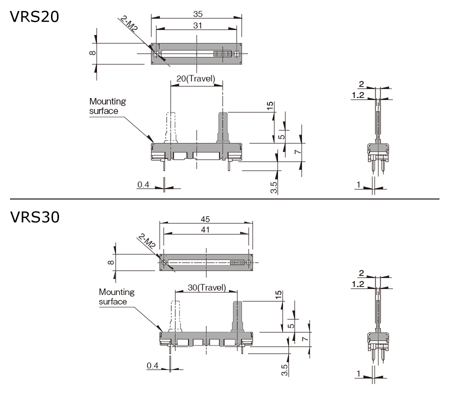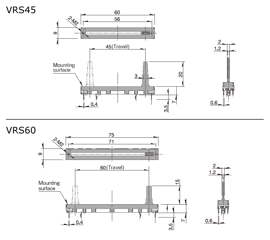 Technical drawing of Vestax ALPS™ slide faders VRS type are available also here: VRS45/60 faders and VRS20/30 faders. Other drawings are available in the technical library or upon request on Technical Support.