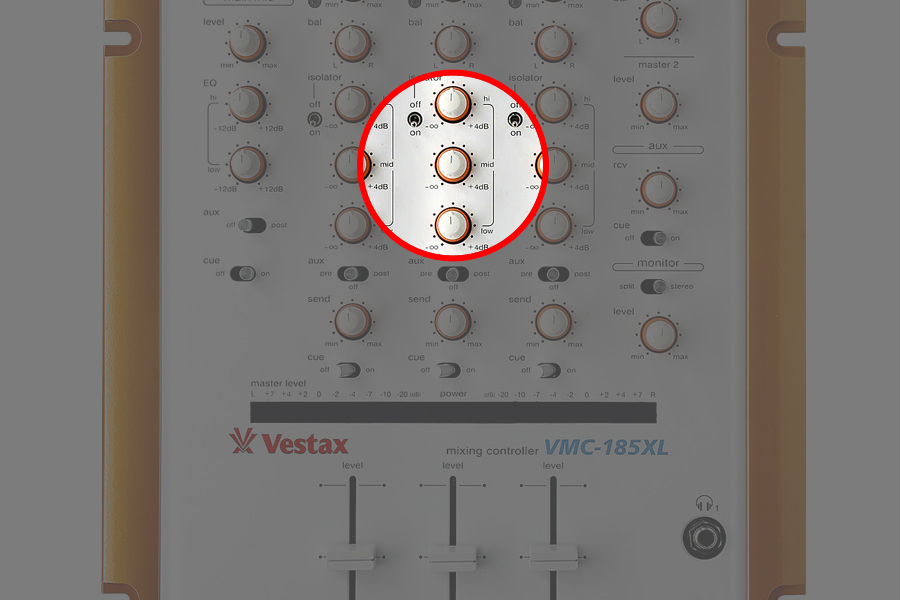 - ISO (EQ - each PGM channel equalizers LOW, MID, HI rot. faders)