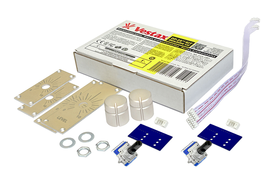 Building SET 2 KIT (pair) - replacement original Japan DF-25 / DF-27 / DF-17 rotary fader KIT for professional mixers. This is building KIT, which you assemble yourself by soldering. KIT contains 2 pc high quality original ALPS™ / ALPHA™ Japan rotary fader, 2 pc faceplate, 21 pc large aluminum Vestax DF-500 Series knob, 2 pair of nut and pad for fixing ALPS™ rotary fader on top cover panel (faceplate), 2 pc Vestax PCB mainboard, 2 pc JST/PCB 5PIN 90°R angle connector, 2 pc FLAT cable with JST 5PIN straight connectors. Intended for experienced users only, this building KIT must be assembled by soldering. Assembly is not complicated, it only requires skill when working with solder.