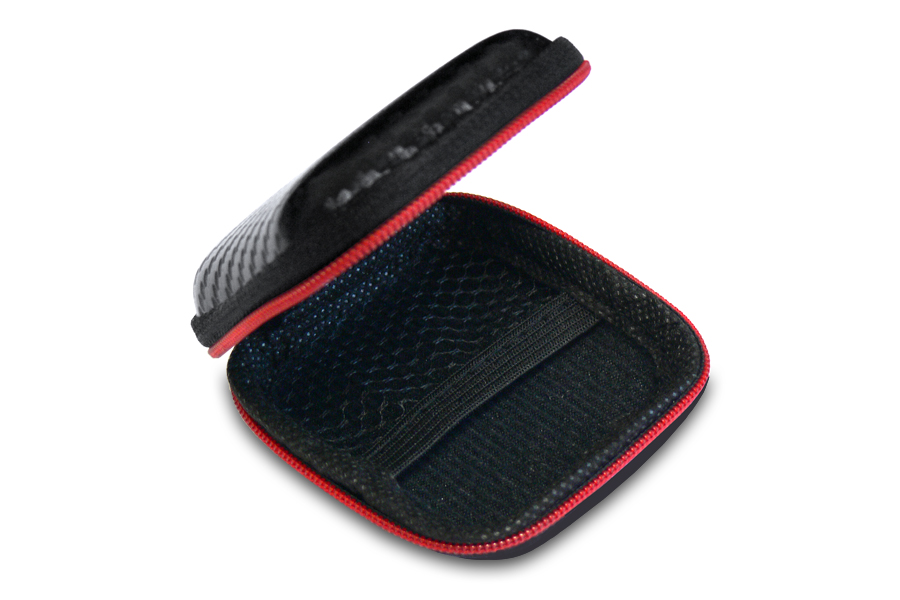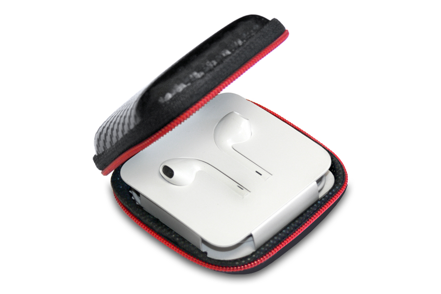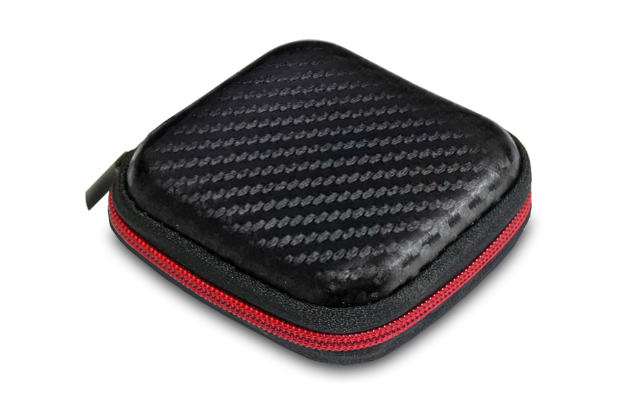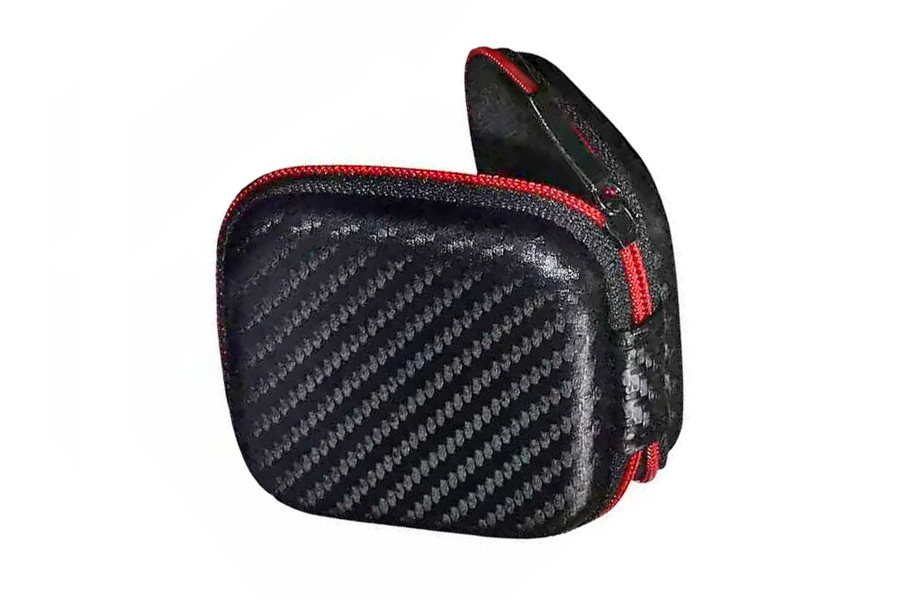Vestax EA Case Bag for headphone earbuds. Bag made of PU / leather with a soft carbon design with a red line and a closure with a black zipper. Inside pocket for safe storage and transport SD memory cards or detachable cable. Designed for Vestax IMX-1 JET earphones or for other similar types of headphone earbuds. Also suitable for small smartphone headphones (for example Apple Airpods or EarPods).