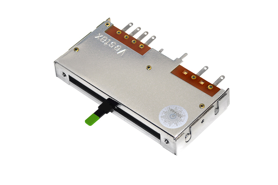 The Vestax Inputfader IF-06 PCV SSF is a standalone channel inputfader for the Vestax PMC-06Pro, Vestax PMC-06Pro A, Vestax PMC-06Pro VCA (Japan version), Vestax PMC-06Pro D Series of battle mixers. It is supplied without PCB for PCB soldering, it is not for easy user replacement and is primarily intended for authorized service repairs. State-of-the-art Plastic Conductive Volume (PCV™) technology is tested for 2 million passes / 1 million cycles by accredited testing laboratories. During this time, it must not lose the quality of the audio signal passing through it (to imagine, the standard faders leave after about 100,000 cycles). These are the minimum guaranteed values. The IF-PCV SSF has a precision metal mechanism and guide shafts on which the fader slider moves and delimits a perfectly accurate position. This simultaneously reduces friction, resulting in less wear and smoother fader movement. It is designed for professional applications such as turntablism or professional club mixers.