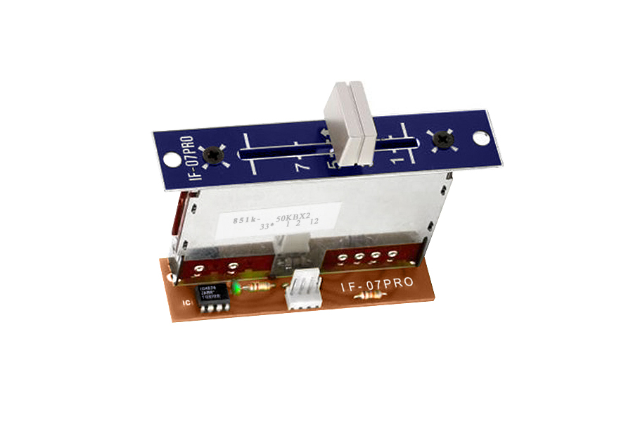 Original Japanese input fader IF-07Pro for Vestax PMC-007 / Vestax PMC-07Pro / Vestax PMC-07Pro D / Vestax PMC-07Pro ISP.  Original factory assembled unit with PCB desk and JST connector and top cover plate marked with lines, including linear fader curve slope adjustment, designed for Vestax mixers.  Complete KIT for quick user replaceable in two variants.