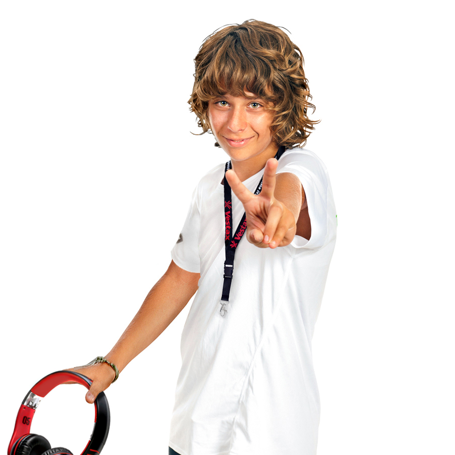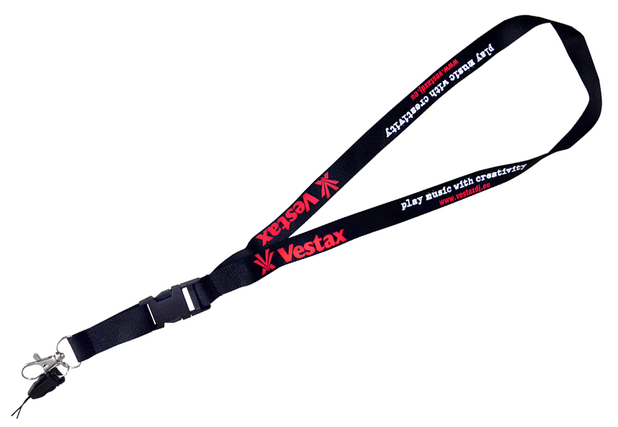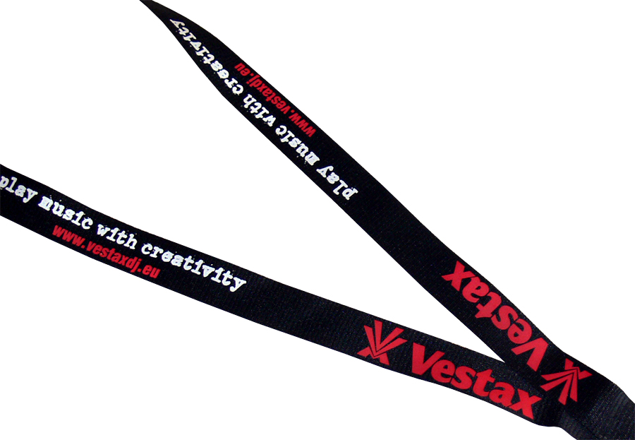Stylish branded Vestax keychain. High-quality Pantone™ color sublimation single-sided print with a rubberized surface resistant to abrasion when worn. A motif is "Vestax - Play Music with Creativity". The keychain is made of 100% polyester fabric with a water-repellent finish; the strap width is 2 cm, the length of the keychain is approximately 68 cm. At the end, the keychain is equipped with a metal carabiner, a mobile phone loop and a detachable ABS buckle (trident).