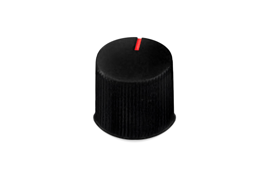 Replacement Polymer / ABS rotary knob with knurls, black with embossing and red line are intended for rotary faders of DEPTH (Controls the FX section) encoders of Vestax VI-380 Series MIDI controllers.