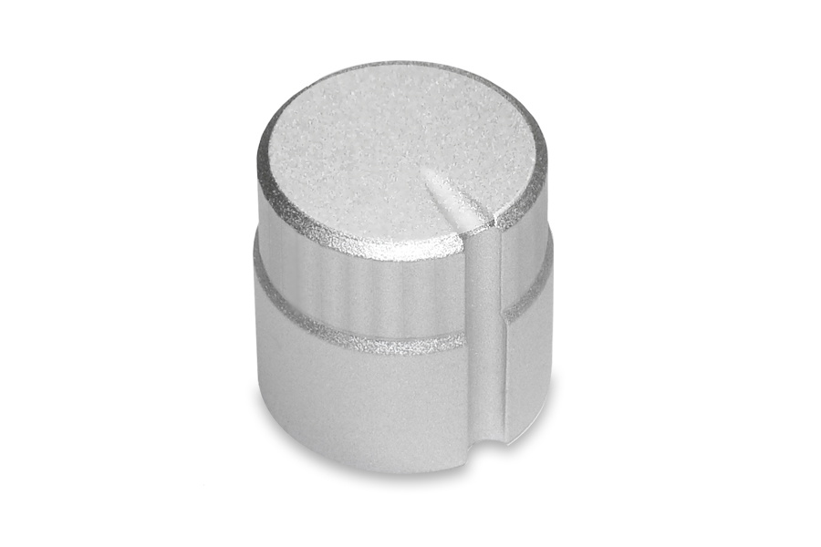 For rotary faders of the FX / ISO section of mixing consoles Vestax R-1 Premium, Vestax R-2 mixer or for PGM section of club mixer Vestax PMC-500 Series / Vestax PMC-CX and older models of mixing consoles like Vestax PMC-25, Vestax PMC-26, Vestax PMC-46 Series and premium rotary KIT´s type Vestax DF-17 KIT, Vestax DF-25 KIT, Vestax DF-27 KIT, Vestax DF-50 KIT, Vestax DF-CX KIT and Vestax DF-500 KIT are provided replacement original Japan knobs made of aluminum alloy. It is produced in 3 variants: S-type with a small locking HEX screw, T-type with inner teflon slotted TEETH type and D-type with inner teflon slotted for D-shaped shaft. Knob is made from metal aluminium body, anodized surface, grooved part of the fingerboard, color shade of matte SILVER.