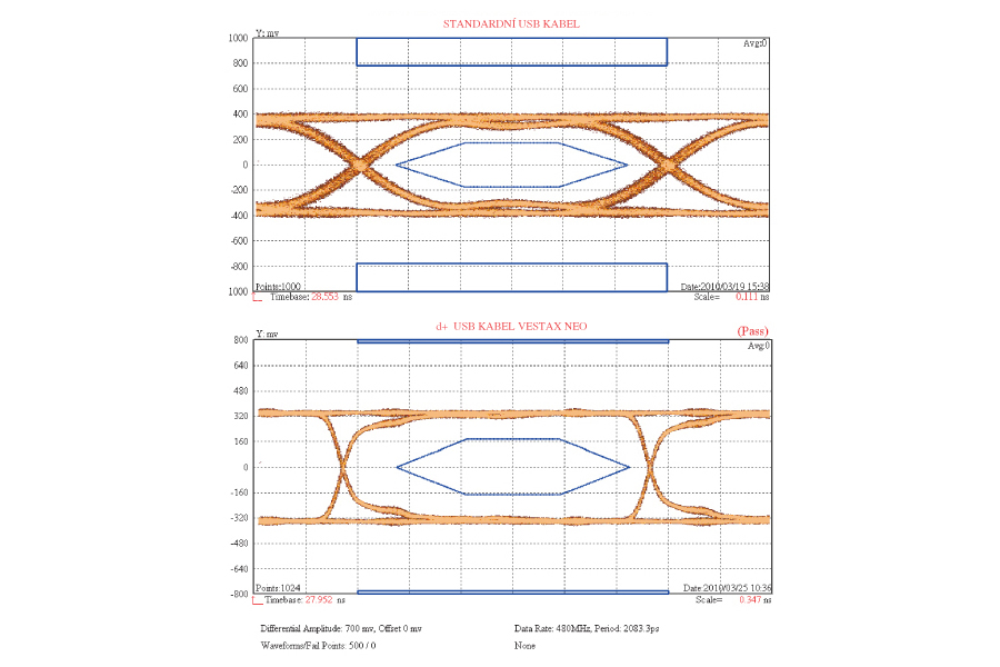 The transmission quality of NEO d + cables was tested by an oscilloscope and a bit error rate tester and is shown in the so-called eye diagram commonly used in telecommunications (see the figure below). An eye diagram is a graph that mimics the function of an oscilloscope, whose time base works periodically with a speed corresponding to the modulation speed (the diagram is named after the shape it depicts - it has the shape of an eye). This diagram clearly shows the degree of degradation of the digital signal after passing through the transmission path.