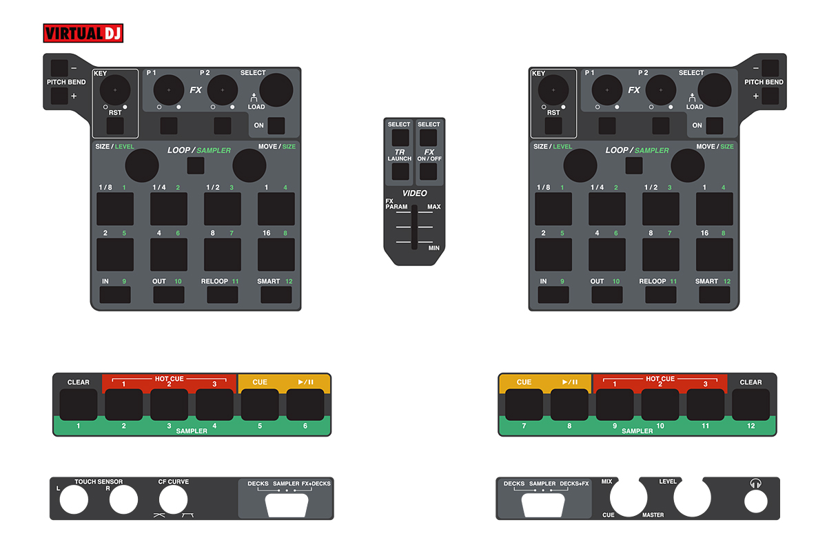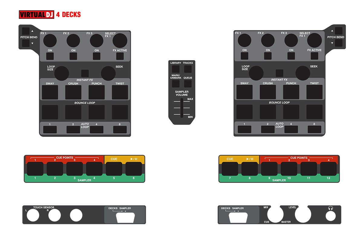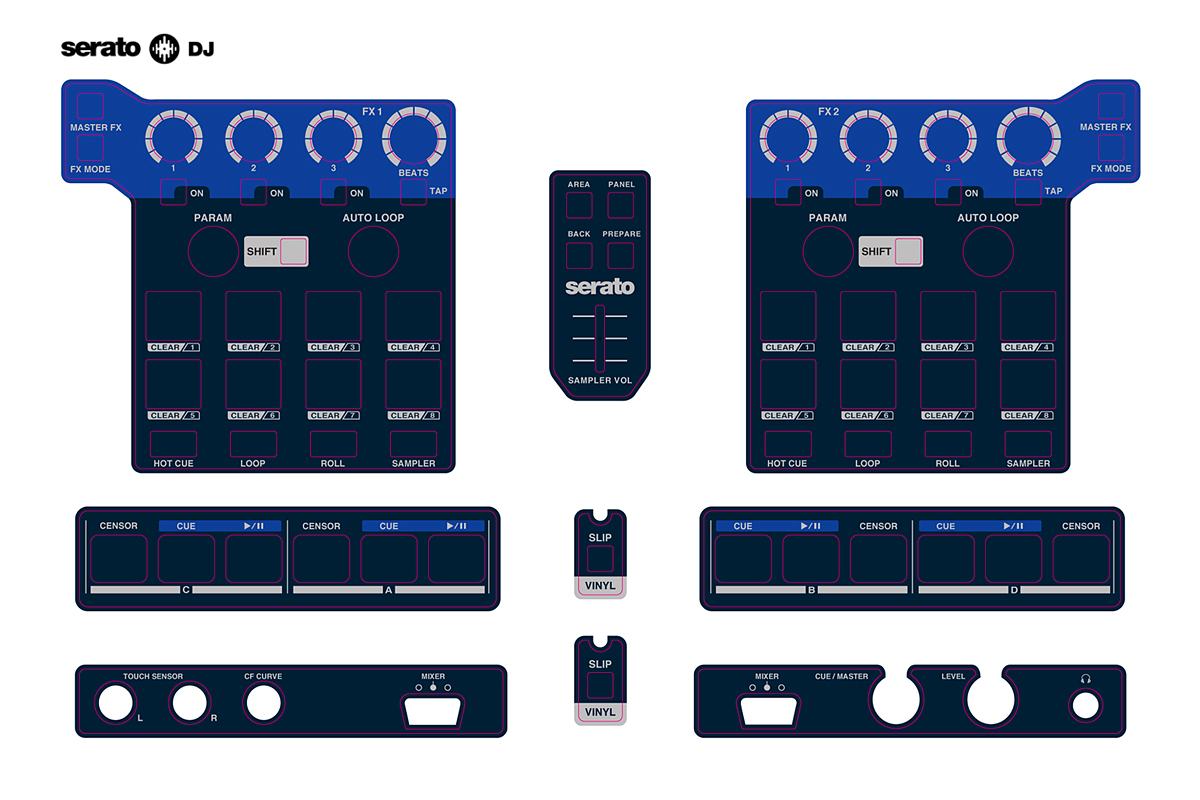 | Design overlay for software | Serato DJ (Hitachi™)* Traktor (3M™) Virtual DJ (3M™) Virtual DJ 4 decks (3M™) Deckadance (3M™) Blank overlay (3M™) |