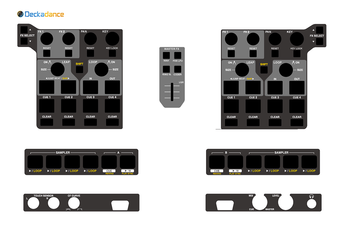 Original Japan factory MIDI faceplate (FP) overlay labels for professional Vestax VCI-400 four-channel MIDI controllers. Premium designed for customizing the front panel of the VCI controller using your chosen software. FP Overlays are made of a special self-adhesive Hitachi™ and 3M™ foil that is easily applied to the front panel of the VCI controller.