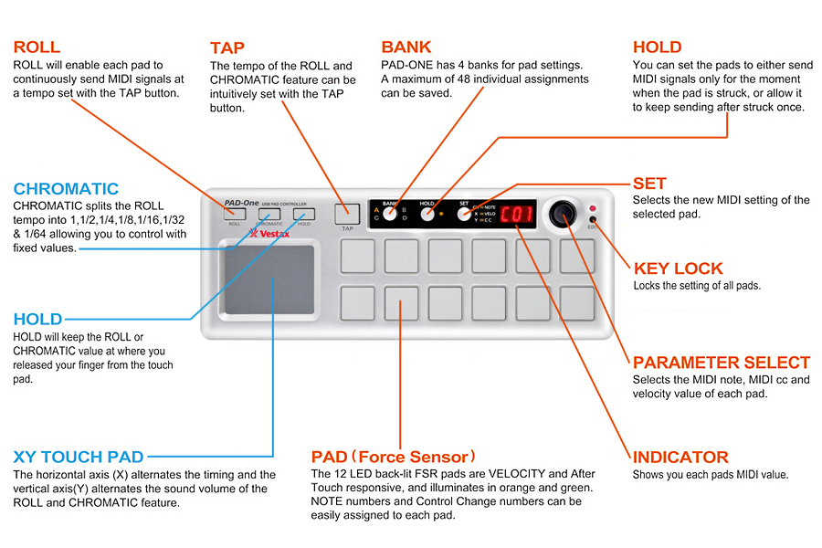 Controller is a small, compact but thanks to its aluminum chassis, a very durable assistant, which is compatible with a wide range of DJ & DAW software applications and can be used to control any standard MIDI device. The Vestax PAD-One is equipped with 12 touch-sensitive low-lift PADs with highly sensitive touch sensors, with a choice of LED backlight color, which is identical for each of the four different memory banks (A, B, C, D). These are distinguished by the color of the PAD backlight.