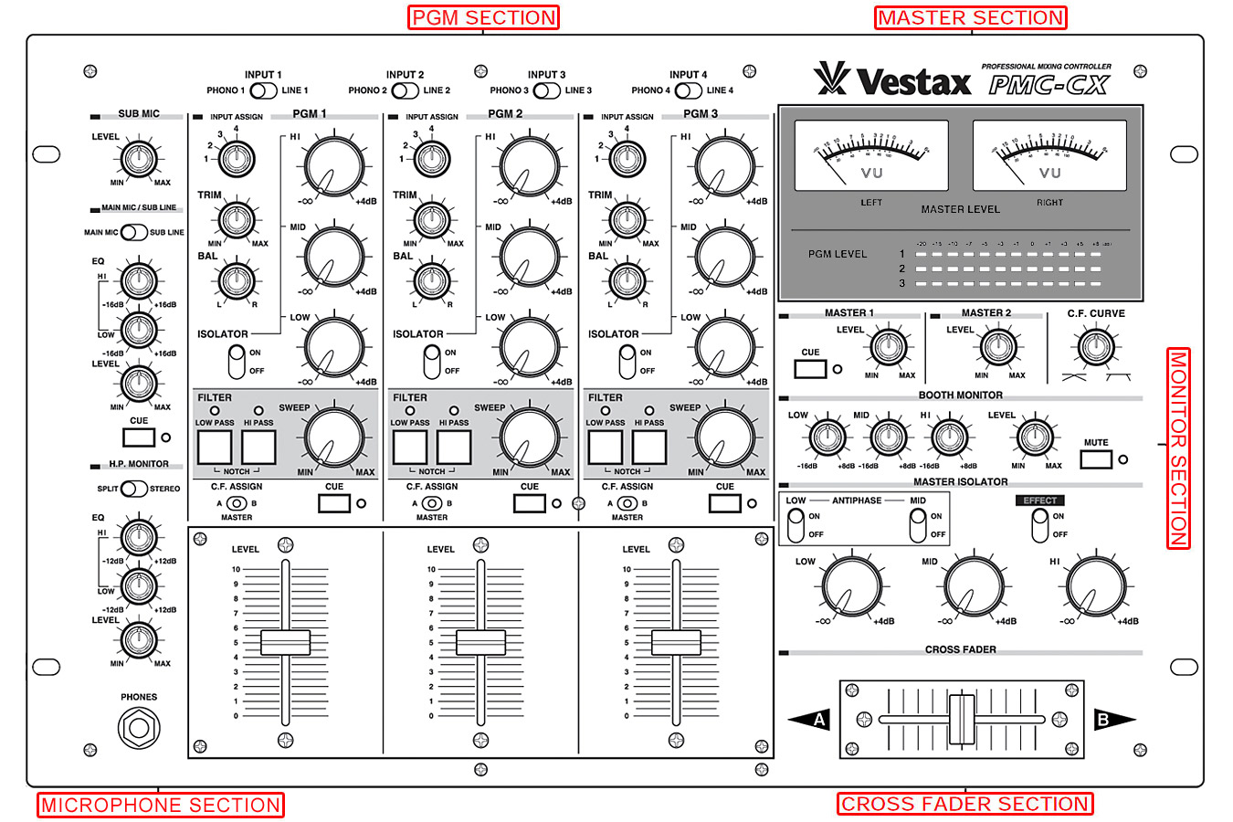 - BOOTH MONITOR Section: EQ (LOW / MID / HI), LEVEL